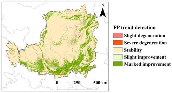 where and respectively represent the FP values in year and year ; n signifies the length of the time series; and denotes the slope of FP change. Specifically, indicates an upward trend in FP, whereas indicates a downward trend.