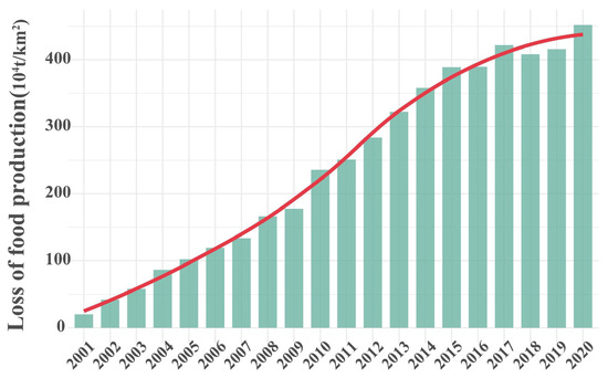 Figure 13 presents the grain production losses caused by CA in the Loess Plateau from 2001 to 2020. The temporal dynamics reveal a fluctuating yet generally increasing trend. From 2001 to 2004, yield losses remained relatively stable at low levels (<100 t). This phase coincided with limited rural labor outmigration and relatively high cropland utilization intensity, when abandonment was not yet widespread, thus exerting only minor impacts on grain production.