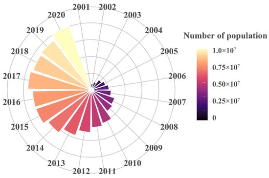 Based on the yield losses induced by CA from 2001 to 2020, we further analyzed the effects on per capita carrying capacity (Figure 14). Overall, the impacts displayed pronounced temporal dynamics, with an overall upward trend. From 2001 to 2005, per capita carrying capacity indicators (e.g., per capita grain availability) remained stable, rising from 0.0399 107 to 0.2041 107. During this stage, CA was limited in scale, exerting negligible effects on carrying capacity, and regional food supply was generally able to meet population demand.