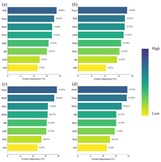 Analysis of the period of 2005–2020 revealed a clear temporal shift in key drivers. In 2005, population density (14.99%), slope (14.25%), and mean annual precipitation (13.64%) were the dominant factors. By 2010, slope (14.46%), population density (13.81%), and mean annual precipitation (13.72%) remained most influential. In 2015, slope (15.52%), mean annual precipitation (14.66%), and mean annual temperature (12.69%) emerged as the leading drivers. By 2020, mean annual precipitation (15.63%), slope (15.43%), and elevation (DEM, 13.81%) became the most important contributors.