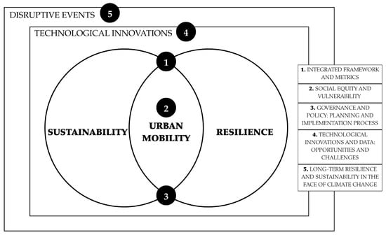 In summary, the literature shows that, although sustainability and resilience are increasingly recognized as essential for urban mobility, their integration remains underdeveloped. Five priority areas emerge at the intersection of the two concepts: (1) the need for integrated frameworks and metrics that enable both concepts to be assessed together; (2) the role of social equity and vulnerability as core aspects of urban mobility that directly influence sustainable and resilient outcomes; (3) governance and policy challenges, particularly in relation to planning and implementation processes that must integrate both perspectives simultaneously; (4) technological innovations and the expanding use of data, which offer significant opportunities but also raise critical challenges; and (5) long-term resilience and sustainability in the face of climate change, where disruptive events emphasize the urgency of strategies that enable urban systems to adapt and endure over time.