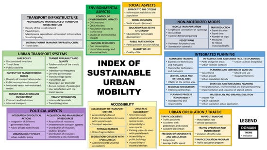 The index was developed through an extensive literature review and field research, drawing upon concepts and elements identified by technicians and managers working at urban and transportation planning agencies or metropolitan regions [31,81]. These elements reflect the most pertinent issues for mobility planning from a practical standpoint. I_SUM is a multifaceted evaluation instrument that comprehensively addresses the three fundamental sustainability dimensions: social, environmental, and economic. It employs a structured hierarchy comprising nine domains, thirty-seven themes, and eighty-seven indicators, offering a systematic approach to assessing sustainability.