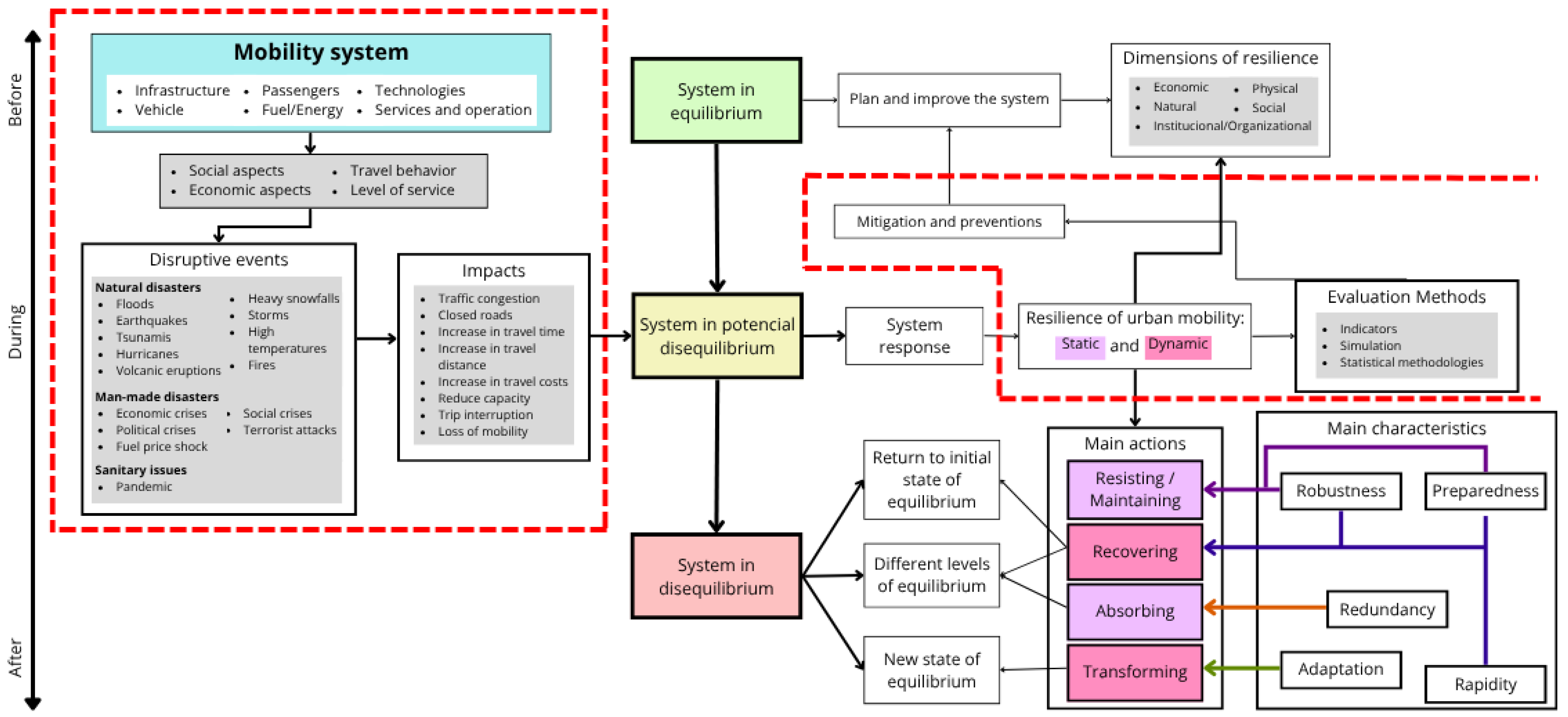 - Review of the literature to structure a framework for resilient urban mobility, including definitions, dimensions, key characteristics, and actions.