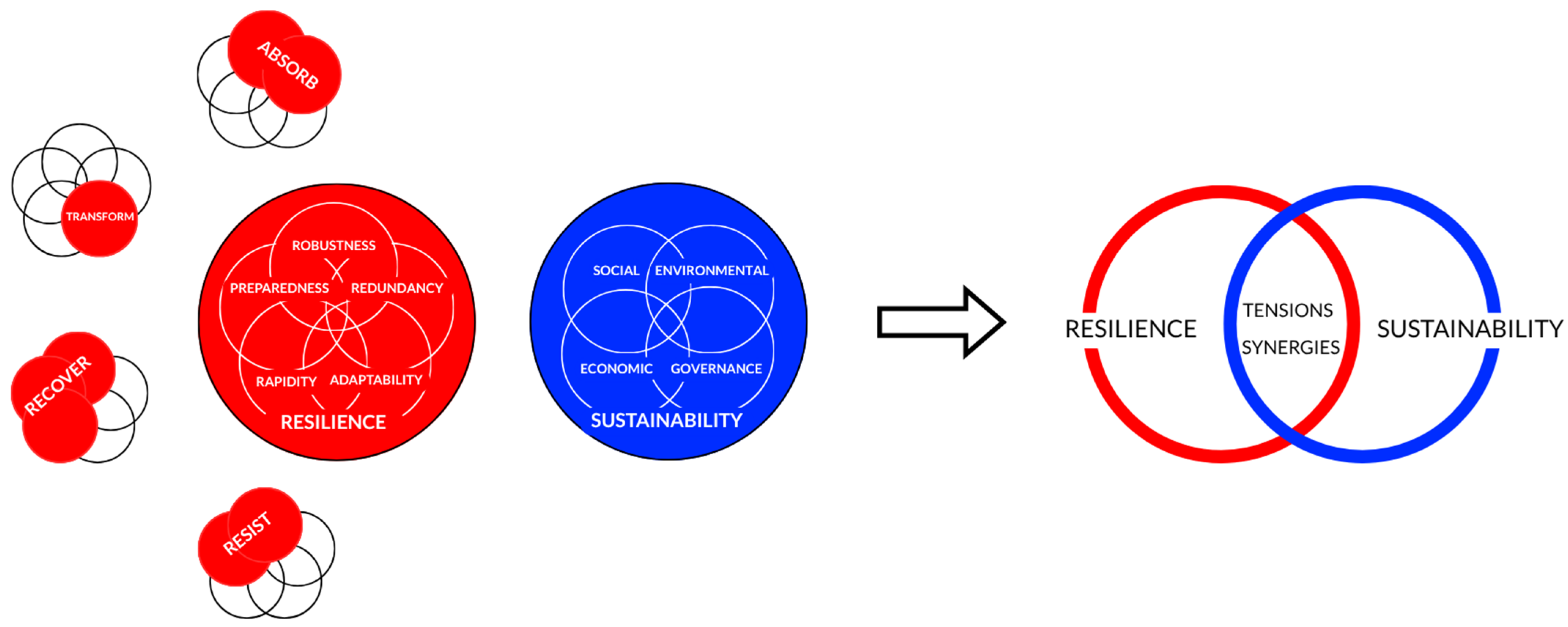 Objectives | To achieve a long-term state that efficiently balances environmental, social and economic results, maximizes well-being, and minimizes damage. | Effectively maintain functionality during and after disruptions, learn and adapt |