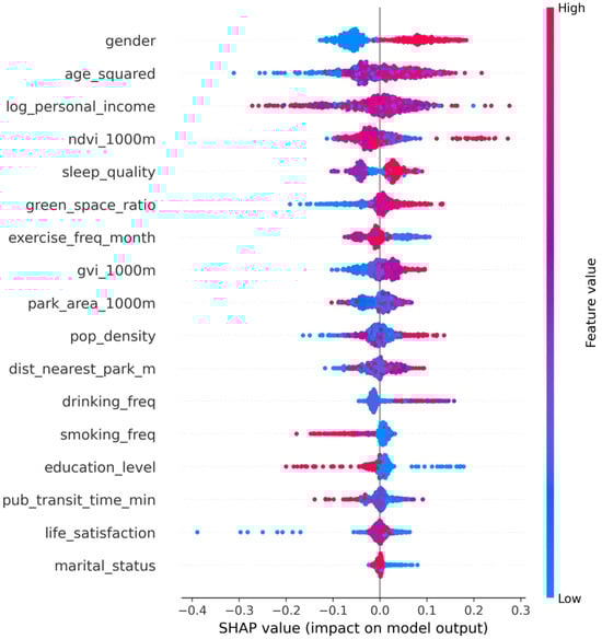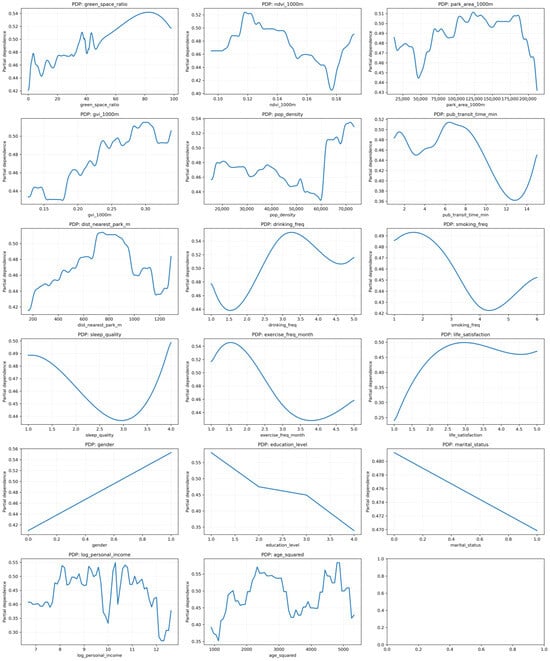 The SHAP value distributions further validated the direction of the main effects (Figure 5). Male gender was consistently associated with higher overweight risk, whereas higher income, more frequent exercise, and better sleep quality were protective. Smoking frequency also showed a negative association, though this should be interpreted cautiously as it reflects body weight outcomes only and does not imply broader health benefits. Several predictors displayed nonlinear or threshold-like patterns, including NDVI, green space ratio, GVI, park area, and distance to the nearest park, as well as behavioral factors such as drinking frequency, exercise frequency, and sleep quality. By contrast, life satisfaction and marital status exerted only weak and unstable effects. Taken together, the convergence of key determinants across methods and the presence of theoretically plausible nonlinearities strengthen confidence in the robustness of the results.