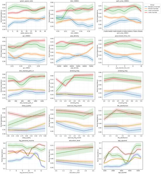 Full-sample partial dependence analysis revealed distinct and often nonlinear associations between overweight risk and built environment, lifestyle, and socioeconomic predictors (Figure 2). Both the green space ratio and GVI were positively associated with overweight, with risk increasing steadily and peaking at approximately 70–80% and 0.30, respectively. Park area within 1000 m and distance to the nearest park followed inverted U-shaped patterns: overweight probability peaked at ~100,000–175,000 m2 for park area and ~700–900 m for park distance, with lower risks observed when park area exceeded 180,000 m2 or distance reached 1100–1200 m. NDVI, population density, and public transit time displayed wave-like curves with clear inflection points. NDVI shifted from protective to risk-enhancing at ~0.18; population density minimized risk between 20,000 and 60,000 persons/km2 but increased beyond 60,000 persons/km2; and public transit time showed the lowest risk at ~12–14 min, whereas shorter times (6–8 min) were associated with higher risk. Lifestyle behaviors exhibited similarly complex associations. Smoking frequency and sleep quality both reduced risk up to moderate levels (around three to four times per week for smoking), after which the effect attenuated or reversed. Drinking frequency followed an inverted U-shape, with risk peaking at ~three times per week before declining at higher levels. Exercise frequency was consistently protective, with risk declining sharply until two to three sessions per week, after which the effect plateaued. Life satisfaction showed a positive association, with overweight risk rising sharply up to a score of three and stabilizing thereafter. Socioeconomic attributes produced comparatively stable associations. Gender was positively linked to overweight, with men at higher risk than women. Marital status exerted a protective effect, as married individuals consistently exhibited lower risk compared with their unmarried counterparts. Education level was inversely associated with overweight, suggesting that higher educational attainment reduces risk. By contrast, personal income displayed fluctuations without a clear monotonic trend, while age (squared) showed a nonlinear trajectory with oscillating risks across age groups rather than a consistent directional effect.
