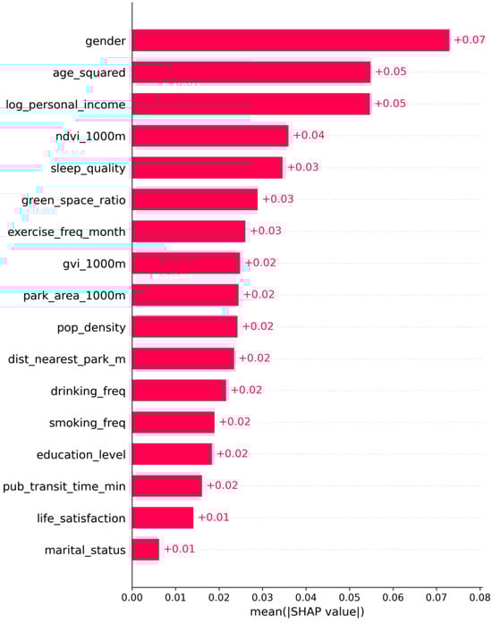 To assess robustness, we compared feature importance rankings from XGBoost with SHAP explanations (Figure 4). Both methods consistently identified gender, age, and personal income as the most influential predictors, underscoring their stability in explaining overweight risk. NDVI also ranked highly across approaches, confirming the importance of greenness exposure. However, the two methods differed in emphasis: SHAP attributed relatively greater importance to behavioral and green space attributes, such as exercise frequency, sleep quality, green space ratio, and GVI, reflecting their nonlinear contributions at the individual level. In contrast, XGBoost highlighted variables such as park area and population density, which serve as frequent splitting criteria in tree construction.