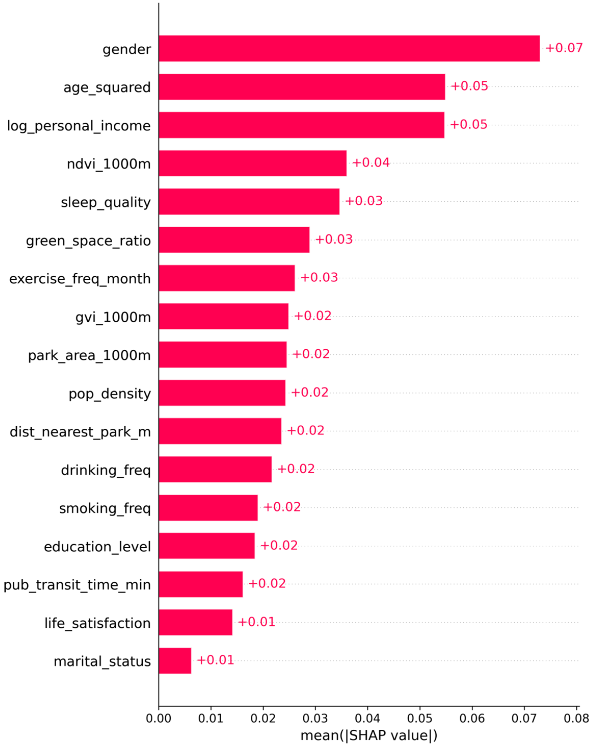 Park area within 1000 m (m2) | 5.37 | 10 | 6.72 | 8 | 6.86 | 6 | 7.07 | 4 | 6.87 | 4 |