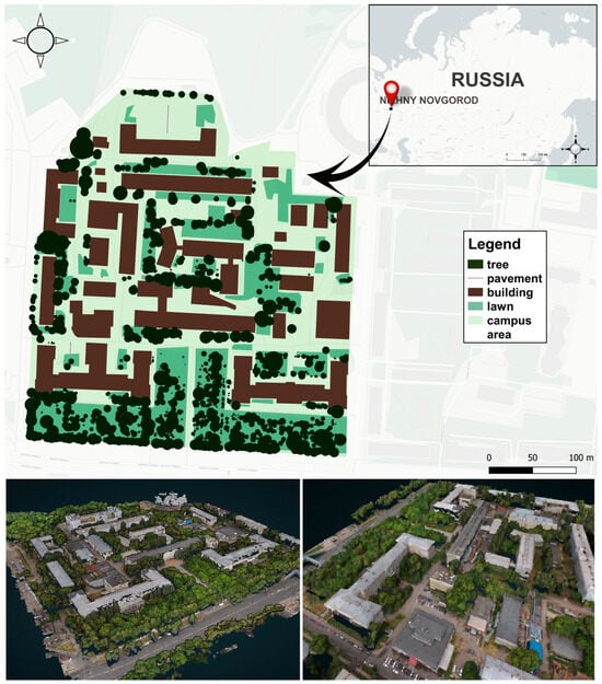 The university campus, a restricted-use area currently spanning 12.98 hectares, is situated in the Upland part of the city. It comprises 17 buildings, including 6 academic and research facilities, 4 student dormitories, 2 training centers, and 5 utility and administrative buildings, alongside mature trees and shrubs both native and exotic to the region (Figure 1 and Figure A1, Appendix A). Located in the historical part of the city, the campus overlooks a major highway characterized by heavy traffic. However, the university’s academic buildings are buffered from the highway by a wide strip of woody and shrubby vegetation. Thus, the type and number of stories of buildings, the presence of a green zone, and the proximity to transport arteries make the campus territory comparable to the historical development of the upper part of Nizhny Novgorod. These ecological contributions support the characterization of the university campus as a representative urban environment.