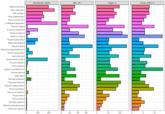 Abundance, average stem diameter at the breath height (dbh), average tree height and average crown width for tree species of Lobachevsky University main campus. Tree species are arranged according to total biomass.