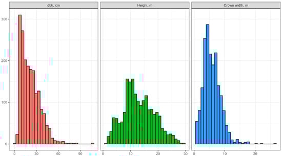 Distribution of stem diameter at the breath height (dbh), tree height and crown width of trees surveyed in the Lobachevsky University main campus.