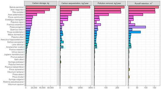 Carbon storage and sequestration, overall air pollution removal and runoff retention for tree species of Lobachevsky University main campus. Tree species are arranged according to total carbon storage.