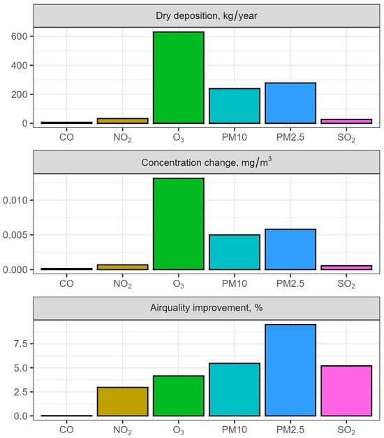 The campus trees contribute to air purification by removing 9.35 g m−2 of pollutants annually. This gross dry deposition value aligns well with typical amounts for the USA and Europe. For example, the median pollution removal for US cities is 10.8 g/m2/yr [63], for London it is 10.04 g/m2/yr [70], and for Barcelona it is 9.3 g/m2/yr. However, the air pollution removal on the Lobachevsky University main campus is significantly higher than in Canadian cities, where the average value is 3.72 g/m2/yr [73]. While ozone showed the greatest concentration change, particulate matter experienced the most significant air quality improvement percentage, whereas carbon monoxide showing the least improvement. This pattern aligns with findings from similar studies in European and North American cities [45,63,73], which also reported maximal removal for O3, SO2, and PM10, and minimal removal for CO.