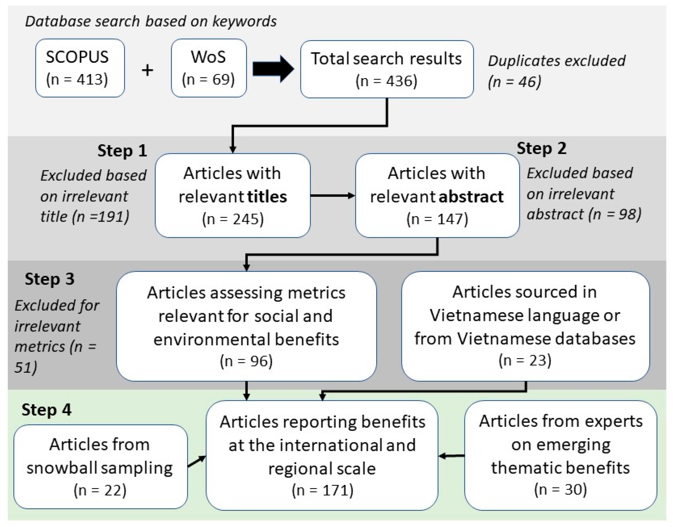 The review involved multiple steps. Firstly, the results of the database searches were compared to filter duplicates. Between the papers found from SCOPUS (n = 413) and Web of Science (papers found n = 69), 46 duplicates were detected, leaving 436 papers for review (Figure 1). Titles were then screened for further review, keeping papers suggesting a context of changes in social or environmental metrics (n = 245). In the next step, papers were screened based on their abstract. Papers that mentioned organic rice contexts where specific aspects were assessed related to environmental or socio-economic changes were kept for in-depth review (n = 147). In a third step, papers were reviewed in depth. All articles with evidence of changes in ORF areas relating to environmental, ecological, social and socio-economic impacts and benefits were considered relevant (n = 96). Further papers were sourced through snowball sampling by reviewing the references of papers selected (n = 22). Publications in the Vietnamese context related were searched using similar search terms in both English and Vietnamese using Google Scholar. Grey literature on government standards, regulations and management policies were sourced from online databases and Vietnamese government websites (n = 23).