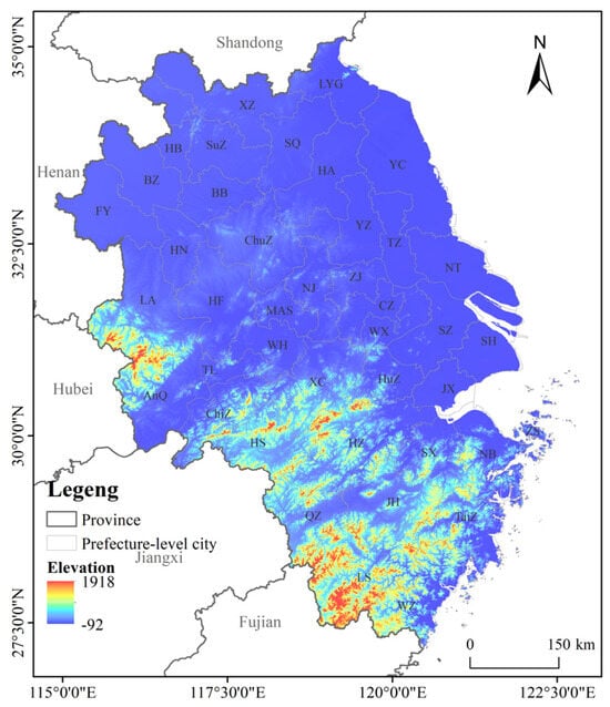 The Yangtze River Delta region (Figure 1) comprises 40 prefecture-level cities from three provinces—Anhui, Jiangsu, and Zhejiang—in addition to the centrally administered municipality of Shanghai, totaling 41 cities. As one of China’s three major urban agglomerations, it lies in the lower reaches of the Yangtze River basin, bordering the East China Sea and the Yellow Sea. With a permanent population of approximately 238 million, the region spans 358,000 square kilometers. As one of China’s most economically developed and highly urbanized regions, its urban spatial expansion continues at a rapid pace, resulting in extensive encroachment upon ecological land. The ecological carrying capacity of certain areas is approaching its limits, while the adverse factors accumulated through rapid urban development have constrained the region’s sustainable development [24].