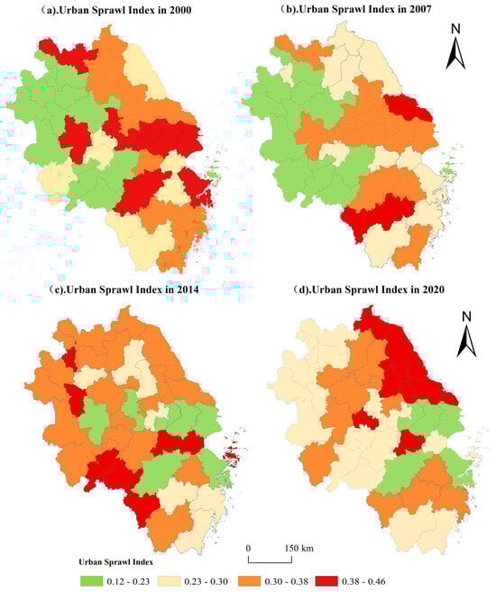 Drawing upon the methodology of Bai Y et al. [44], this study utilised ArcGIS software to map the spatial distribution patterns of urban sprawl in the Yangtze River Delta region from 2000 to 2020 (Figure 2). Lower urban sprawl indices in the figure indicate milder sprawl phenomena in the area, while higher indices signify more pronounced sprawl.