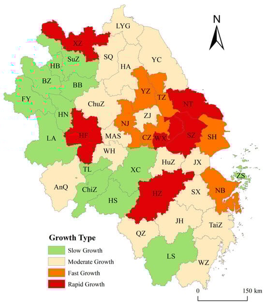 To further elucidate the dynamic evolution of urban sprawl, this study employs the SLOPE method to classify the sprawl indices of 41 cities between 2000 and 2020 into distinct growth patterns [46] (Figure 3). From a county-level perspective, the classification reveals that cities with higher economic levels predominantly fall into the ‘relatively rapid growth’ and ‘rapid growth’ categories, such as Shanghai and Suzhou. This suggests that economically advanced cities tend to allocate greater resources to urban development and construction, resulting in higher urban sprawl indices during periods of expansion. Conversely, cities with relatively lagging economic development predominantly exhibit ‘slow growth’ and ‘moderate growth’ patterns, including most cities within Anhui Province and cities such as Lishui and Quzhou in Zhejiang Province. This disparity reflects a positive correlation between economic strength and the pace and manner of urban sprawl.