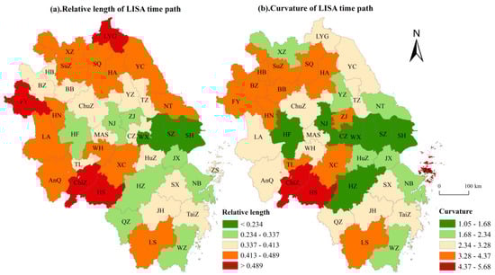 Relative length and curvature of LISA time paths for urban sprawl in the Yangtze River Delta, 2000–2020.
