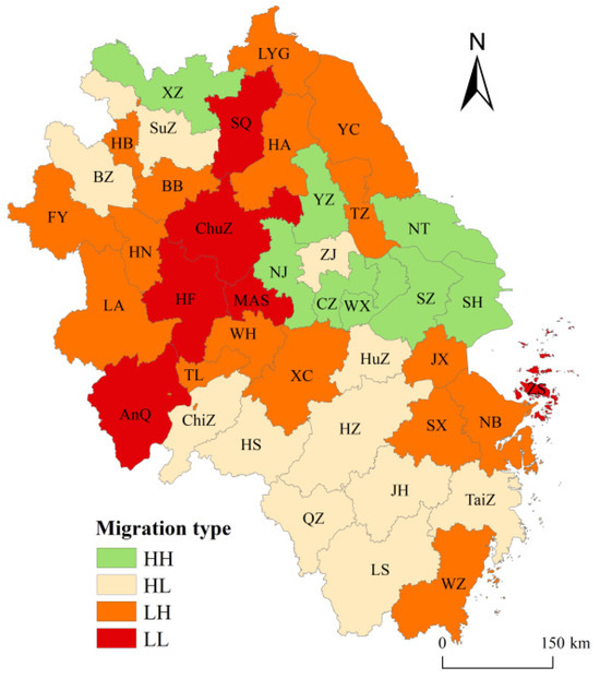 LISA spatiotemporal transitions describe the changes in spatial association types among urban units [38]. These transitions are categorized into four types: I (Stable), II (Transition-Stable), III (Stable-Transition), and IV (Transition). Type I denotes no spatial association transformation in either the unit itself or its neighbors; Type II indicates a transition occurring within the unit while its neighbors remain stable; and Type III signifies a transition occurring in the unit while its neighbors become stable. Type I indicates neither the unit itself nor its neighboring units undergo spatial association type transformation; Type II signifies the unit itself transitions while its neighbors remain stable; Type III denotes the unit itself remains stable while its neighbors’ transition; and Type IV indicates that both the unit itself and its neighbors undergo transition.