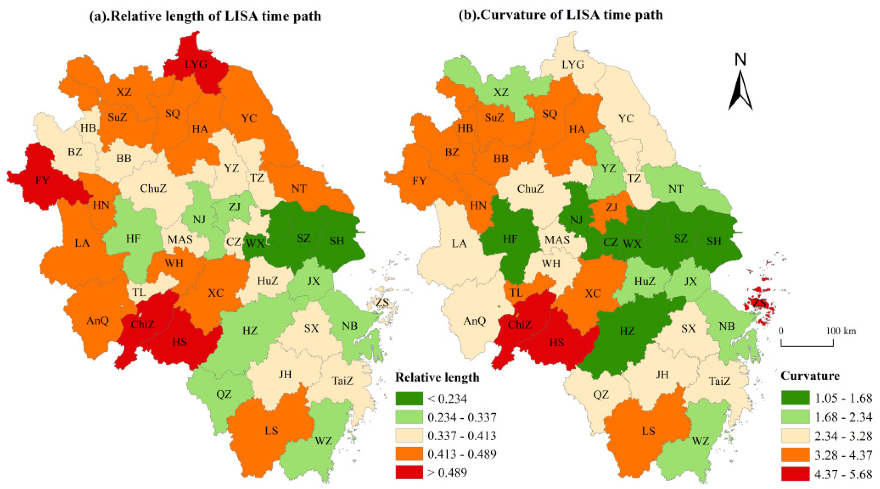 - Most cities within the study area exhibited relatively short LISA time-path lengths, indicating overall spatial stability, particularly in developed cities such as Shanghai and Suzhou and their surrounding regions. In contrast, cities like Fuyang and Lianyungang demonstrated relatively dynamic local spatial structures. Additionally, Chizhou, Huangshan, and Zhoushan—cities influenced by tourism—exhibited stronger local spatial dependencies. Between 2000 and 2020, the curvature of LISA time paths for most cities in the study area was below average, indicating that the overall influence of local spatial patterns on urban sprawl was relatively weak. Most cities did not experience significant spatio-temporal jumps, demonstrating strong inertia in the transition of urban units and a high degree of stability in the associative patterns of urban sprawl.