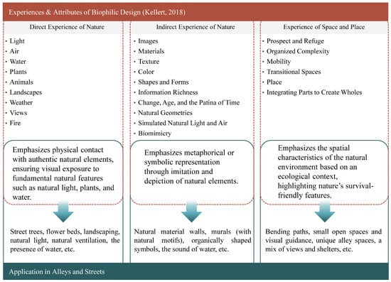 Kellert [8] conceptualized biophilic design within three broad categories of experience, further specified into 25 design attributes (Figure 1). Direct experience of nature involves incorporating actual natural elements, such as street trees, potted plants, or architectural openings that allow natural light to enter alleys. Indirect experience of nature refers to the use of materials, patterns, and colors that mimic natural qualities, including patterned façades, the use of wood or stone, and soundscapes evocative of natural environments. Experience of space and place highlights spatial and cognitive experiences, exemplified by alley curvatures, courtyards, or vantage points that shape one’s engagement with the environment.
