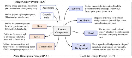 Nevertheless, the quality of generative AI outputs is strongly influenced not only by model architecture but also by the systematic design of prompts. Lee and Park [17], for instance, proposed a biophilic design prompt framework to guide the application of generative AI in architectural and spatial contexts. Drawing on this approach, the present study adapts and structures prompt components for application within urban-landscape contexts, as illustrated in Figure 2.