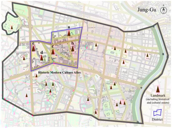 Site map of Jung-gu, Daegu, indicating the “Historic Modern Culture Alley” route and key landmarks (a–e) used to contextualize the four alley typologies. a: Daegu Modern History Museum, b: Yakjeon Jin Alley, c: Gyesan Cathedral, d: 3.1 Independence Movement Stairs, e: Dongsan Missionary Houses.