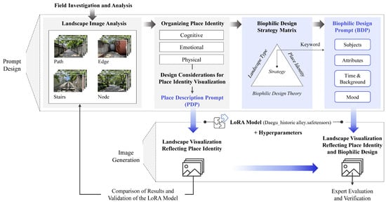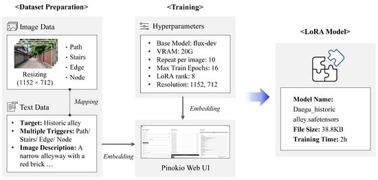 Building on this development, this study employs a Flux-based LoRA model. Flux, a state-of-the-art text-to-image model, performs better than conventional diffusion models due to its efficient memory structure and enhanced visual fidelity [28]. Notably, it excels in rendering contextual details such as texture, light, and spatial depth [28,29], making it particularly suitable for landscapes with layered meanings and embedded place identity, such as historic alleys.