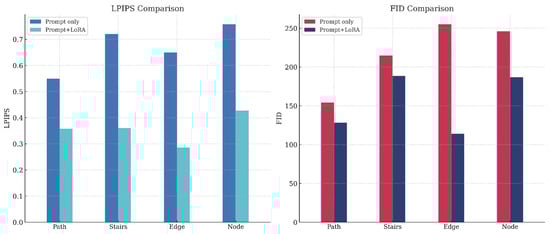 Notes: Quantitative comparison of image similarity metrics (LPIPS and FID) between prompt-only and prompt+LoRA conditions for each alley type. Values are expressed as mean ± SD. Both metrics showed large effect sizes (Cohen’s d > 1 in all cases), indicating that LoRA fine-tuning significantly improved perceptual and statistical similarity to ground-truth images.