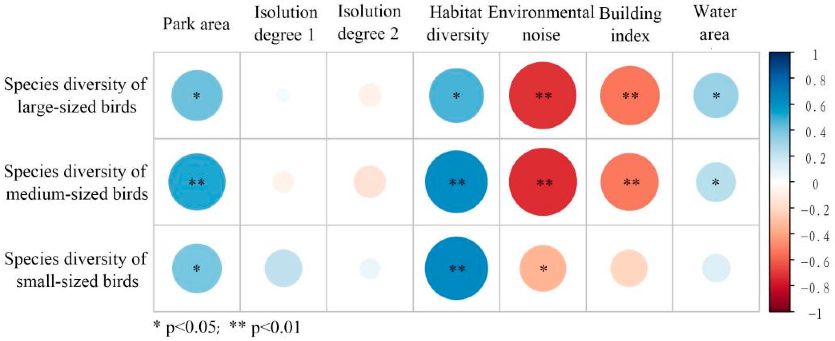 - Environmental noise (EN) and building index (BI) showed significant negative associations, primarily for medium- and large-sized birds.