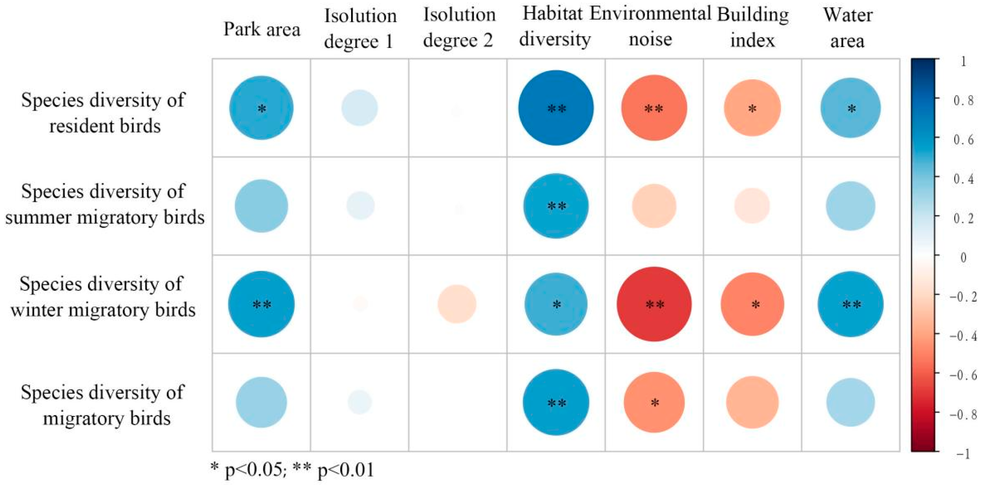 - Environmental noise and building index demonstrated negative correlations with avian diversity, with stronger effects observed for resident and wintering birds.