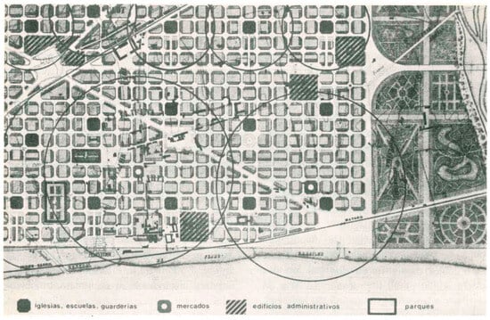 5] (p. 101). “For [Cerdà], urbanism was a tool to diminish the differences in the living conditions of the various social classes, particularly in Old Barcelona. The population’s health and education achieved through service provision throughout the urban network introduced a perception of a modern way of living. Then, his proposal implied regularly distributing basic services throughout the Expansion section” [