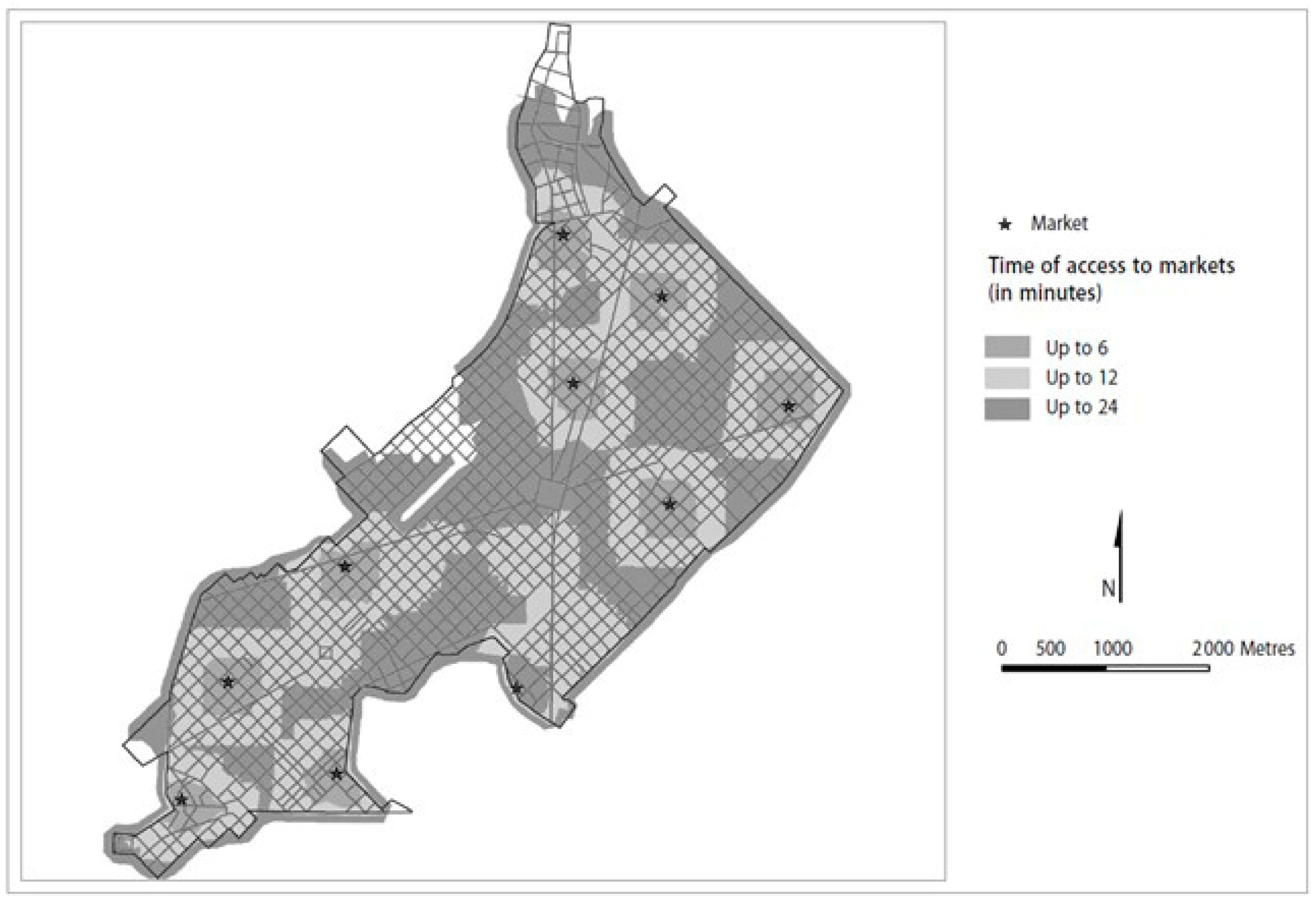 6], shows the isochrones in minutes of access to services, according to the three-level hierarchy proposed by this plan (neighborhood level: school, church, barracks; district level: market; sector level: urban park, hospital, administrative services).