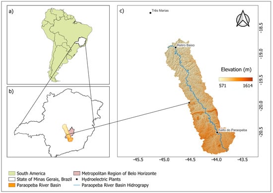 Geographical location of the Minas Gerais state in South America (a), Paraopeba River Basin location in the Minas Gerais state (b), and Paraopeba River Basin digital elevation model and hydropower plants (c).
