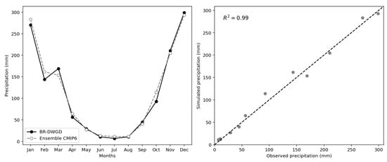 Mean monthly precipitation of the seven GCMs (ensemble) and the observed data from the BR-DWGD in the current scenario.