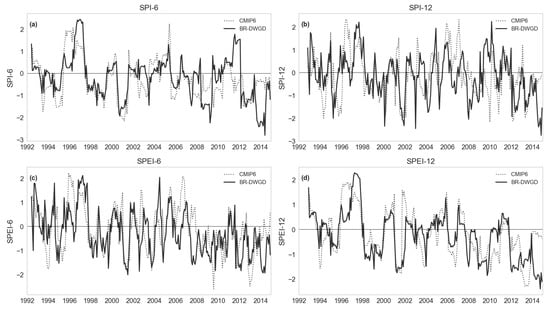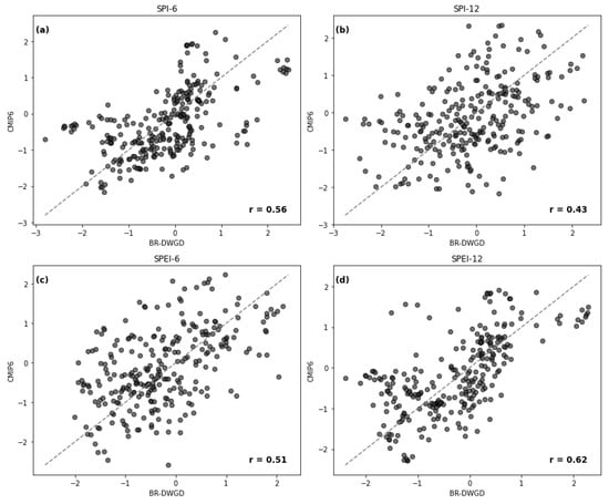 Scatter plots comparing SPI and SPEI values derived from the ensemble climate models (NEX-GDDP-CMIP6) versus BR-DWGD, for the period 1992 to 2014 and for different timescales. (a) SPI-6—six months; (b) SPI-12—twelve months; (c) SPEI-6—six months; (d) SPEI-12—twelve months.