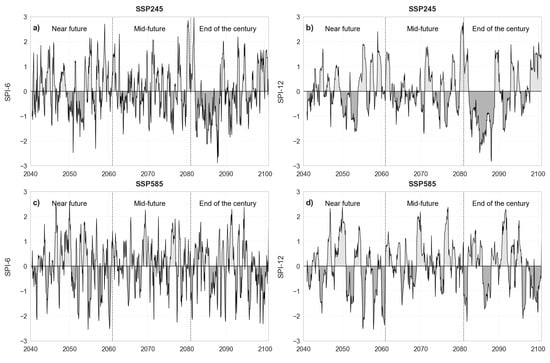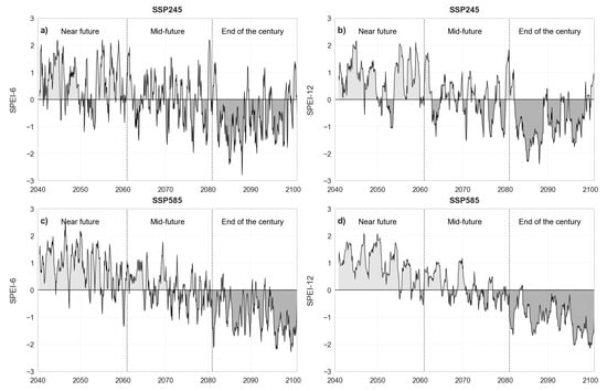 Standardized Precipitation and Evapotranspiration Index (SPEI) projected over the 21st century for the Paraopeba River Basin: (a) scenario SSP245—six months; (b) scenario SSP245—twelve months; (c) scenario SSP585—six months; and (d) scenario SSP585—twelve months.
