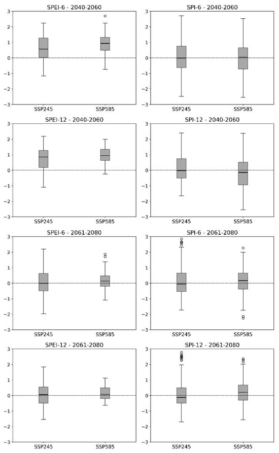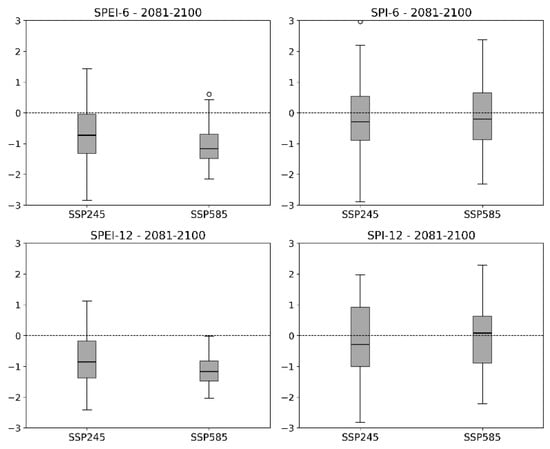 Boxplot of 2040–2060, 2061–2080, and 2081–2100 periods for the SPI and SPEI for the Paraopeba River Basin, in the SSP245 and SSP585 scenarios and timescale of six and twelve months.