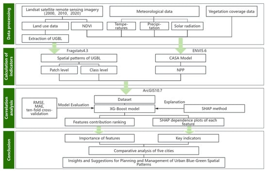 This study consists of four main components: (1) quantification of blue–green space pattern characteristics, (2) calculation of carbon sequestration benefits, (3) identification of key influencing factors, and (4) analysis of underlying mechanisms. First, landscape metrics at both patch and class levels were selected to quantify the spatial characteristics of blue–green spaces. Second, the CASA model was applied to calculate the net primary productivity (NPP) of the five case cities for the three study years. Third, random sampling points were generated to construct datasets, and an XGBoost model was developed to establish the relationships between UBGS pattern characteristics and NPP. By calculating SHAP values, the contributions of different UBGS pattern features to carbon sequestration benefits were examined. Finally, a comparative analysis was conducted to identify the key blue–green space indicators influencing carbon sequestration across the five cities, highlighting both similarities and differences in the mechanisms of carbon sequestration benefits. The overall research workflow is illustrated in Figure 3.