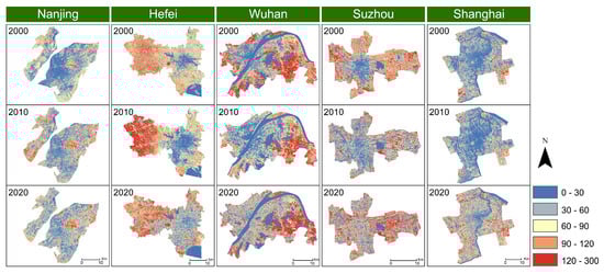 Finally, the NPP results were classified using the natural breaks method, and the spatial distribution of NPP in the central urban areas of the five case cities across three research years was obtained (Figure 4).