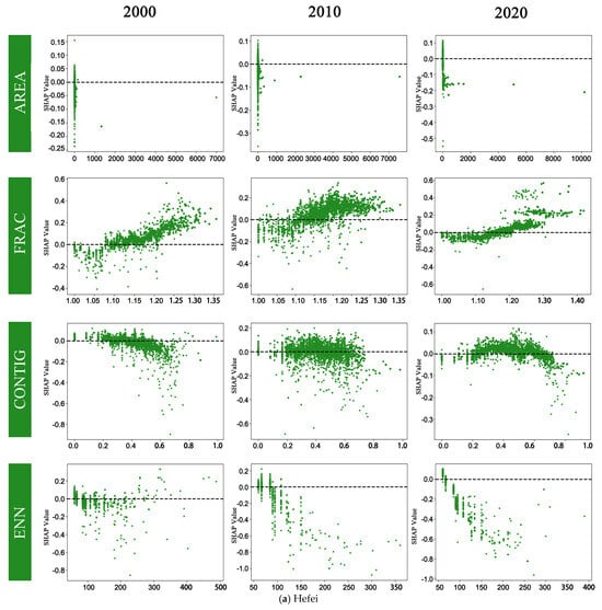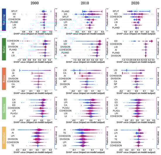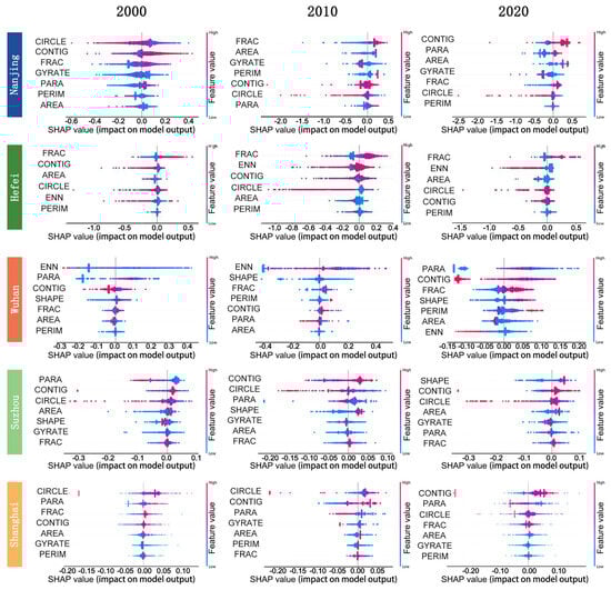 Figure 5 and Figure 6 present the computational and analytical results of the XGBoost and SHAP models at the patch level and class level, respectively. The importance of blue–green spatial configuration features influencing carbon sequestration in each case city is ranked from top to bottom.