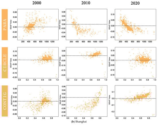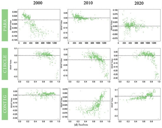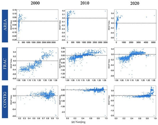 FRAC, representing shape complexity, shows a general positive correlation with NPP across the five cities and is a key factor in Nanjing, Hefei, and Wuhan. This indicates that greater patch complexity enhances carbon sequestration. Possible mechanisms include two complementary processes. First, complex shapes promote energy and material exchange with surrounding ecological patches, strengthening ecological functionality. Moreover, higher shape complexity often corresponds to areas with greater natural vegetation cover and lower human disturbance, resulting in more stable ecosystems and stronger carbon sequestrations. However, when FRAC values become excessively high, the growth of NPP tends to plateau, suggesting a possible “threshold effect,” similar to the nonlinear characteristics observed in the cooling effects of blue–green spaces [22]. PARA emerges as a major influencing factor in Suzhou, Shanghai, and Wuhan, where it shows a negative correlation with NPP. This may be attributed to the regularization of patch shapes, which weakens ecological functionality. Previous research has indicated that increased shape regularity reduces landscape connectivity, thereby constraining carbon sequestration [23]. CIRCLE is a key variable in Suzhou and Shanghai. When its values exceed 0.8, SHAP values decline, indicating that linear or irregular patches are more favorable for carbon sequestration than circular ones. Possible explanations include two interrelated mechanisms. First, high circularity often results from intensive human intervention, leading to habitat homogenization and diminished ecosystem services. Moreover, according to the “form–function coupling” theory [24], overly regular geometries hinder the evolution of natural ecological processes, thereby restricting vegetation productivity. In addition, CONTIG demonstrates a significant positive effect on NPP within the [0.6, 1.0] interval, confirming that highly connected patches serve as effective ecological corridors that facilitate genetic flow, enhance vegetation productivity, and strengthen carbon sequestration capacity.