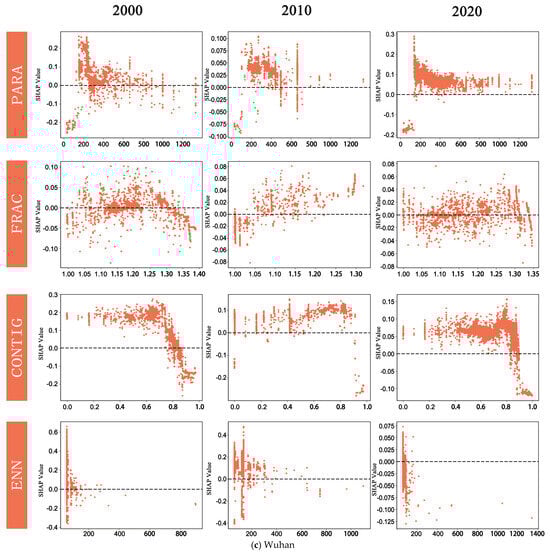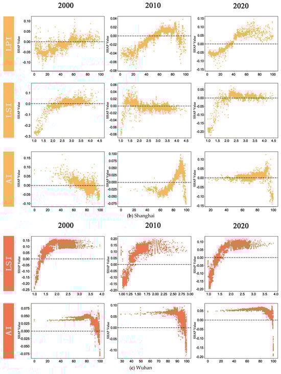 Finally, differences in the responses of aggregation index (AI) and SPLIT highlighted the influence of urban development stages and planning strategies. In Shanghai, AI was positively correlated with NPP, reflecting the city’s efforts to enhance landscape integrity through ecological corridors and wetland conservation [41]. In contrast, Wuhan’s rapid urbanization induced severe landscape fragmentation, resulting in a negative correlation between AI and NPP. This comparison underscores the urgency of protecting and restoring blue–green spaces during urban expansion and demonstrates the potential of planning interventions to regulate carbon sequestration outcomes. Importantly, these differentiated SHAP-derived responses reveal that planning strategies can quantitatively reshape the ecological performance of urban landscapes, offering evidence-based insights for climate-resilient urban design.