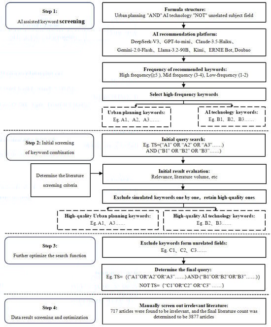 The data for this study were obtained from the Web of Science Core Collection. The retrieval was conducted on 20 March 2025, covering the period from January 1984 to January 2025. The selected document types included articles, proceedings papers, and review articles. The covered disciplines spanned Engineering, Electrical, Electronic, Computer Science, Information Systems, Artificial Intelligence, Remote Sensing, Environmental Science, Urban Studies, Architecture, Urban Planning, and Construction Building Technology. We employed eight AI platforms (DeepSeek-V3, GPT-4o-mini, Claude-3.5-Haiku, Gemini-2.0-Flash, Llama-3.2-90B, Kimi, Wenxin Yiyan, and Doubao) to screen and refine keywords comprehensively (a summary of keyword frequencies is provided in Table 1). Based on this, the final search query was defined as follows:
