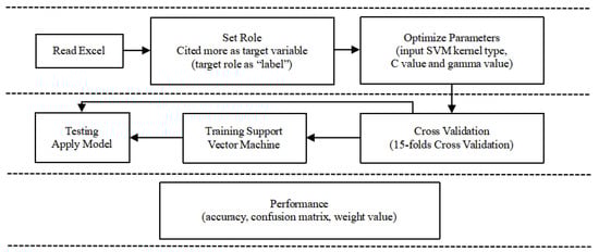 This study employs a Support Vector Machine (SVM) model with a Radial Basis Function (RBF) kernel (Equation (1) [57]) to classify and predict future keywords. In Equation (1), K(x(i), x(j)) represents the kernel function, and (gamma) denotes the characteristic width of the RBF. The penalty parameter CCC is applied to minimize classification error, and a grid search method is used to optimize parameters and enhance model performance [58].
