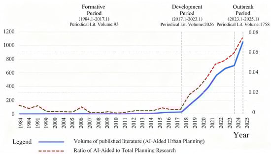 To gain a preliminary understanding of the developmental trajectory of the “application of AI technologies in urban planning,” a comprehensive analysis of the literature data was conducted. Findings indicate that since AI technologies were first applied in urban planning in 1984 [65], the evolution of this field—based on the annual volume of publications, research directions, and core technologies—can be broadly divided into three stages: the embryonic stage (January 1984–January 2017), the development stage (January 2017–January 2023), and the explosive growth stage (January 2023–January 2025). Notably, The number of publications in the two-year explosive growth stage was 3.6 times that of the previous 39 years combined (in Figure 4).