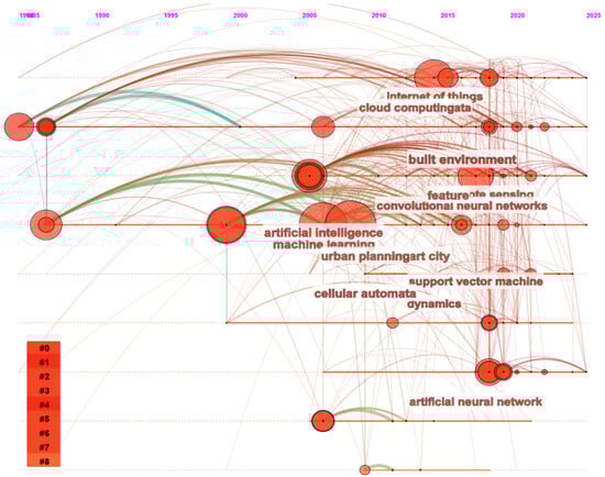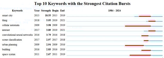 Finally, a burst term analysis was conducted on the literature from January 1984 to January 2025 (Figure 5). Overall, the number of burst terms was relatively limited. Early research was relatively theoretical. The earliest burst terms, “urban planning” and “cellular automata,” emerged in 2009, with durations of 7 years and 10 years, respectively, and moderate burst intensities, reflecting the long-term, incremental optimization of technologies and the relative stability of research themes. “Cellular automata” have been widely applied in analyzing complex urban planning datasets from multiple sources and can serve as pre-processing or post-processing tools for machine learning. This makes them a critical foundation for the deep integration and development of AI technologies within urban planning. In 2011, the term “space syntax” emerged, introducing a new demand in urban planning by revealing the influence of architectural and urban forms on social behavior through quantitative analysis of topological, geometric, and spatial relationships. In 2015, the concept of the “smart city” entered the view of a growing number of urban planning researchers, and the application of AI technologies in urban planning rapidly began to deepen. The emergence of burst terms such as “scene classification” and “convolutional neural network” in 2016 and 2017 reflected a further deepening of research directions and technologies during the rapid development phase, particularly in scenario-based applications. No burst terms have yet been identified in the explosive growth phase, which may be attributable to this period’s relatively short time span. However, it also reflects the trend toward a more focused and fine-grained research landscape during this stage, in contrast with earlier periods.