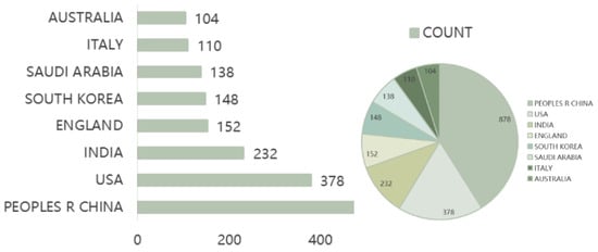 - Ranking of National Research OutputThe number of publications from each country was compiled by analyzing the countries of origin for data within the literature database (Figure 6). The analysis revealed that China (PEOPLES R CHINA) has produced the most significant volume of research in the field of “the application of AI technologies in urban planning,” with a total of 878 publications, accounting for approximately 35% of all publications (joint publications by multiple countries were counted only once). The United States (USA) ranked second with 378 publications, comprising about 15%. Other countries with a relatively abundant research output include India (INDIA) with 232 publications, England (ENGLAND) with 152, South Korea (SOUTH KOREA) with 148, Saudi Arabia (SAUDI ARABIA) with 138, Italy (ITALY) with 110, Canada (CANADA) with 109, and Australia (AUSTRALIA) with 104. All remaining countries each contributed fewer than 100 publications.