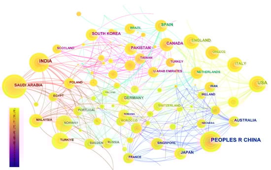 - National Collaboration NetworkCollaborative relationships among researchers from different countries were evident. A country co-occurrence analysis was conducted to construct a national collaboration network (Figure 7), thereby uncovering patterns of international collaboration.