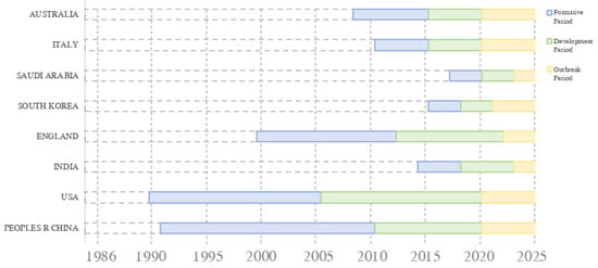 - National Research CharacteristicsA data analysis and content review were conducted on countries with more than 100 publications to understand each country’s research profile. These countries’ developmental trajectories can be broadly categorized as shown in Figure 8. Most countries progress from foundational AI technologies to complex system integration, eventually focusing on sustainability, ethics, and brilliant processes. This evolution is typically demonstrated as follows: in the emergence phase, there is basic technical exploration and initial policy planning, with a low volume of publications; in the rapid development phase, research becomes more specialized and scenario-oriented, accompanied by systematic policy frameworks and a significant increase in publication volume; in the explosive growth phase, cutting-edge technologies such as generative AI and digital twins emerge rapidly, full-process applications are deepened, and the integration with national policy and strategic frameworks becomes more prominent.